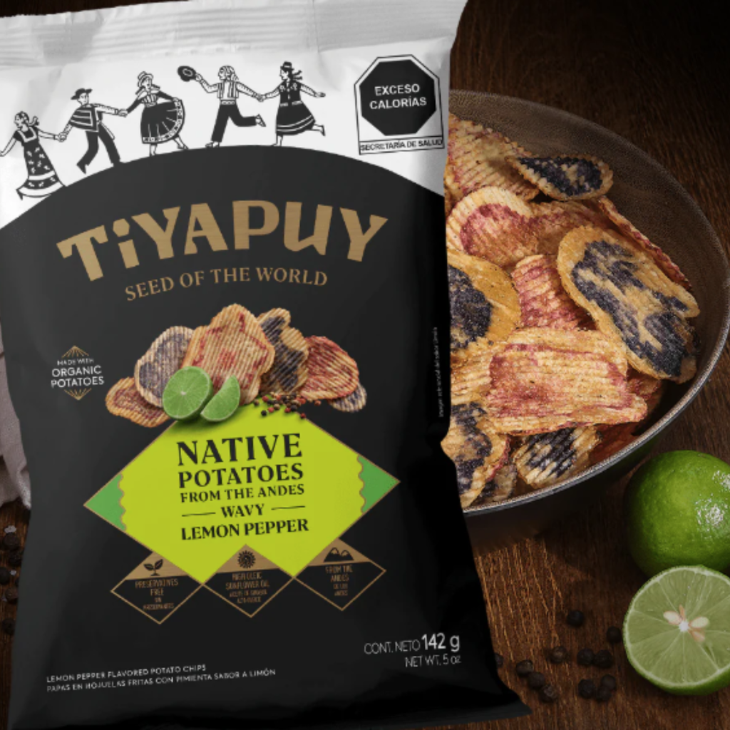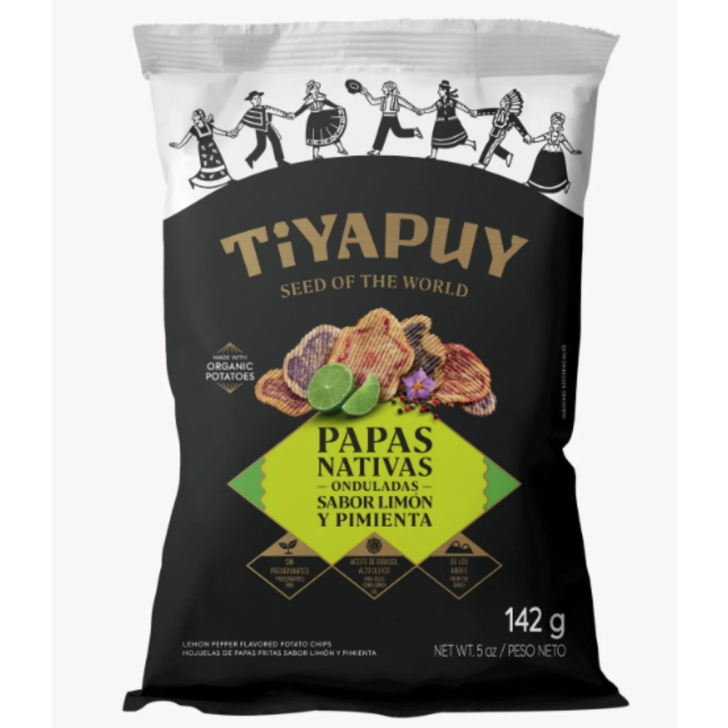 Wavy native potato chips, seasoned with Maras salt, prepared with high oleic sunflower oil and lemon and pepper flavor. Delicious naturallly colorful native potatoes, grown at more than 2500 m above sea level and harvested by hand by our farmers. A perfect combination of lemon and pepper with natural flavorings that gives us that citrus flavor and the spiciness of pepper.