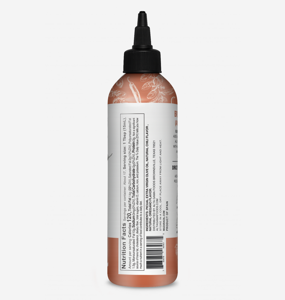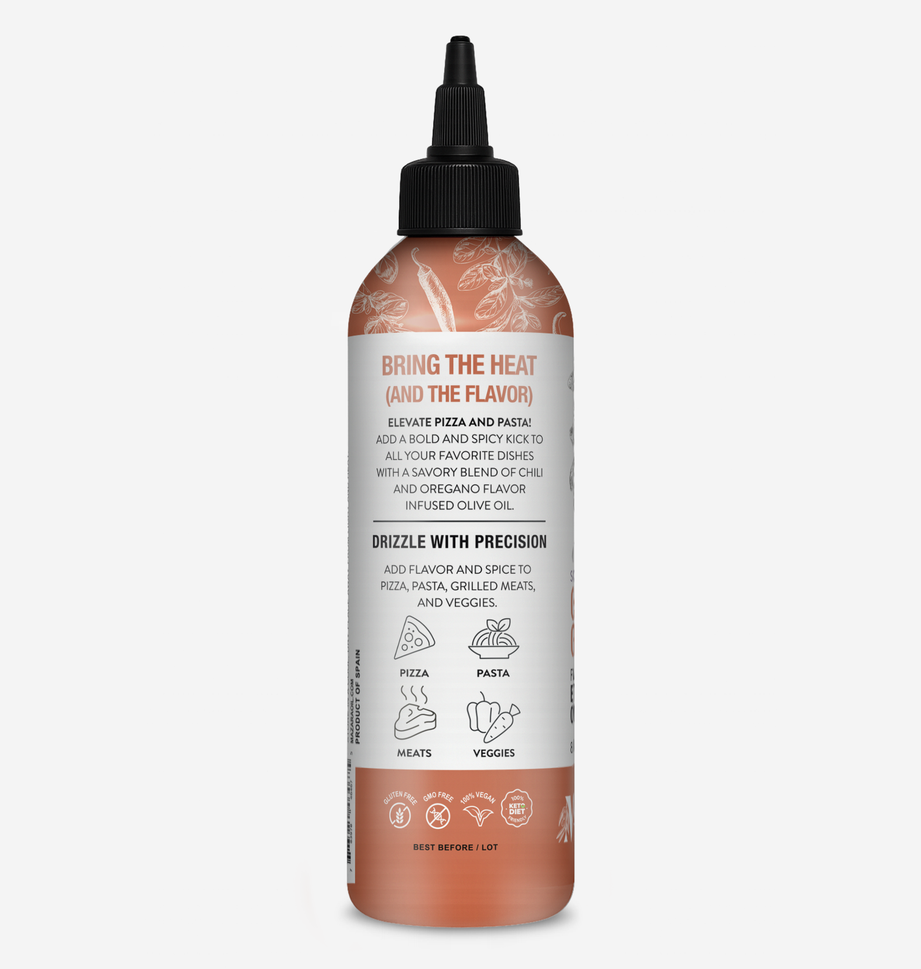 Add a bold, aromatic kick to your dishes with Mazara Premium Squeezable Spanish Chili & Oregano Olive Oil. Crafted from high-quality Spanish Picual olives and infused with the warmth of chili and the earthy depth of oregano, this extra-virgin olive oil delivers a perfectly balanced fusion of heat and herbaceous flavor. Cold-extracted to retain its natural polyphenols and antioxidants, it provides both culinary excellence and health benefits. The precision-designed squeezable bottle ensures effortless control, allowing for the perfect drizzle or pour with no mess.