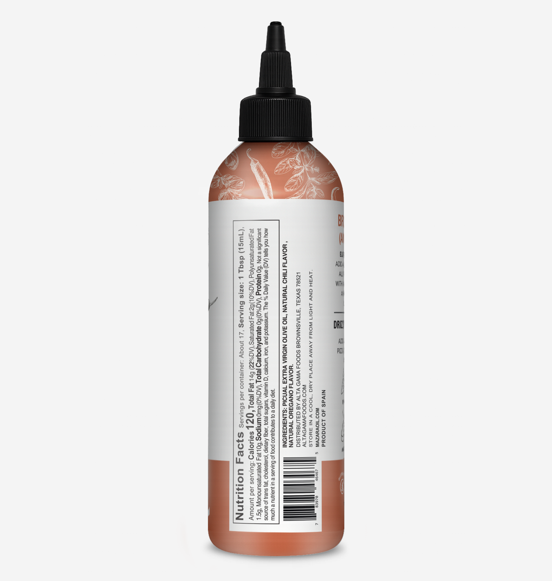 Our Picual olives are sourced from Spain’s renowned olive groves and harvested at peak maturity to produce a rich, full-bodied extra-virgin olive oil. Cold-pressed within hours of picking, this oil maintains its vibrant freshness, robust structure, and high polyphenol content. Infused with carefully selected chili and oregano, it develops a layered, aromatic depth that enhances a variety of dishes with its warm, Mediterranean-inspired flavor profile.