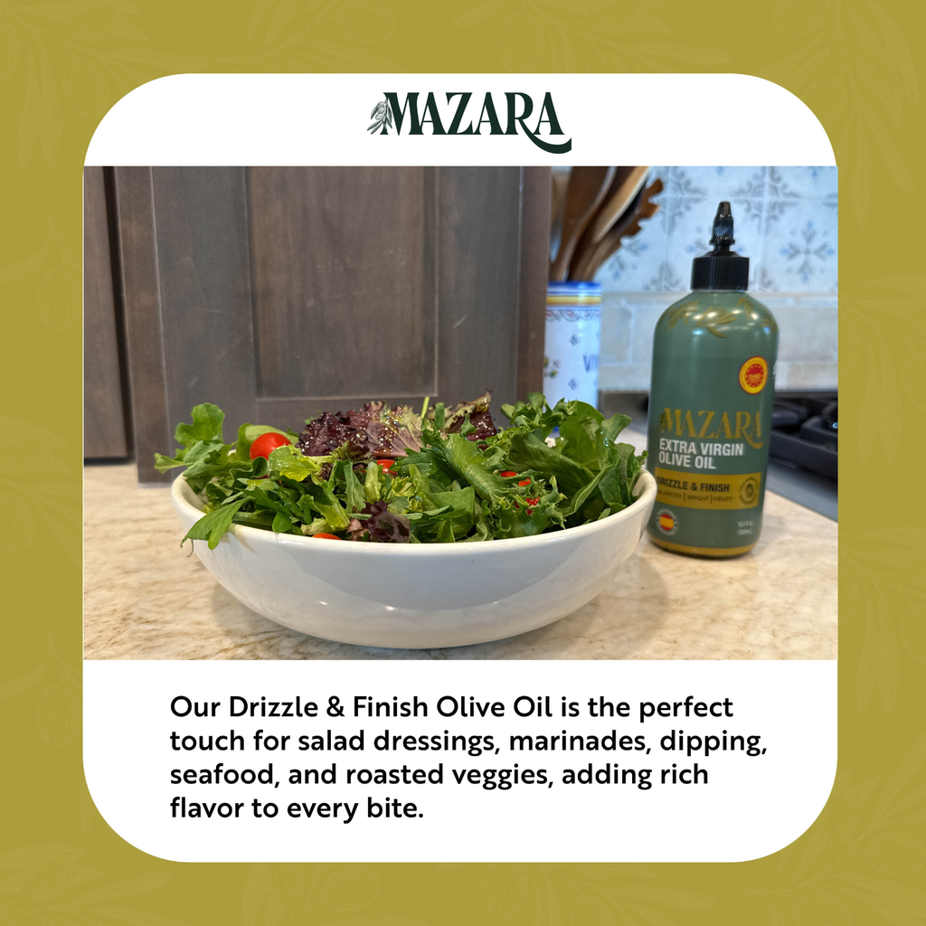 Mazara Squeezable Spanish Drizzle and Finishing Olive Oil is specially crafted to enhance dishes after cooking. Ideal for drizzling over salads, grilled vegetables, pasta, or artisan bread, its bold flavor profile adds an exquisite final touch. Use it to finish soups, roasted meats, or even desserts for an extra layer of richness. With its smooth pour and controlled squeeze bottle, achieving the perfect amount of olive oil has never been easier—bringing the essence of premium Spanish olive oil directly to your table.