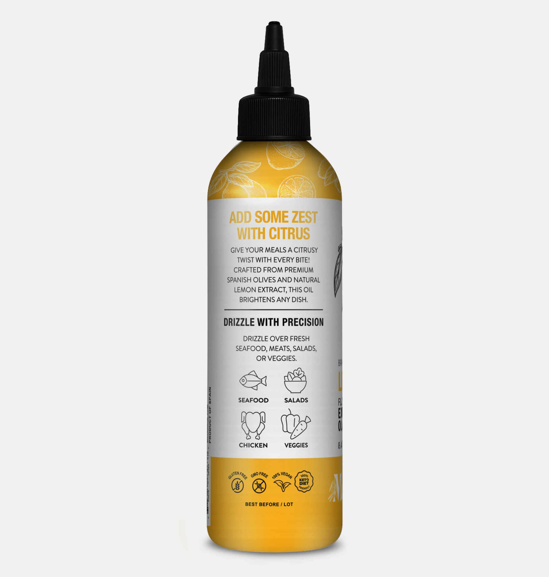 Mazara Premium Squeezable Spanish Lemon Olive Oil is the perfect way to infuse your meals with a refreshing citrus twist. Drizzle it over salads, roasted vegetables, grilled seafood, or pasta for a burst of flavor. It’s also ideal for finishing dishes like grilled chicken, fish, or even pizza, adding a unique depth of citrus to every bite. Use it to elevate dressings, marinades, and dips, or even enhance desserts and baked goods with a touch of lemony sophistication. The convenient squeezable bottle ensures precise application, making this lemon-infused olive oil a versatile, essential addition to your kitchen.
