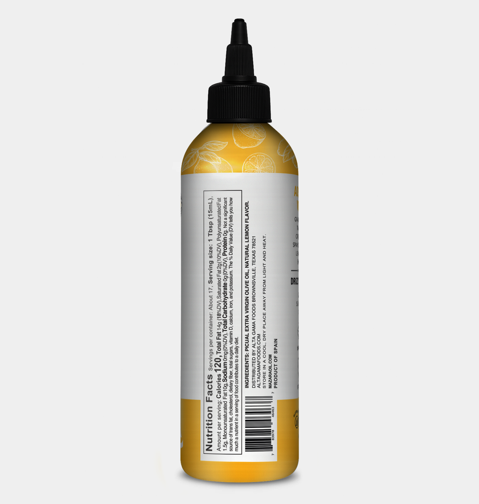 Mazara Premium Lemon-Infused Extra Virgin Olive Oil is a gourmet Spanish EVOO made from 100% Picual olives, cold-extracted for freshness and antioxidants, and infused with natural lemon flavor for a bright, citrus twist. This 8.45 fl oz (250ml) finishing oil is perfect for drizzling over seafood, pasta, grilled meats, roasted vegetables, salads, and bread dips, instantly adding zest and Mediterranean flair to any dish. Vegan, gluten-free, non-GMO, and keto-friendly, Mazara delivers both bold flavor and heart-healthy benefits in every drop. Made in Spain and packaged in a convenient squeezable bottle, it combines authentic tradition with modern convenience, making it the ideal lemon olive oil for everyday cooking and gourmet finishing.